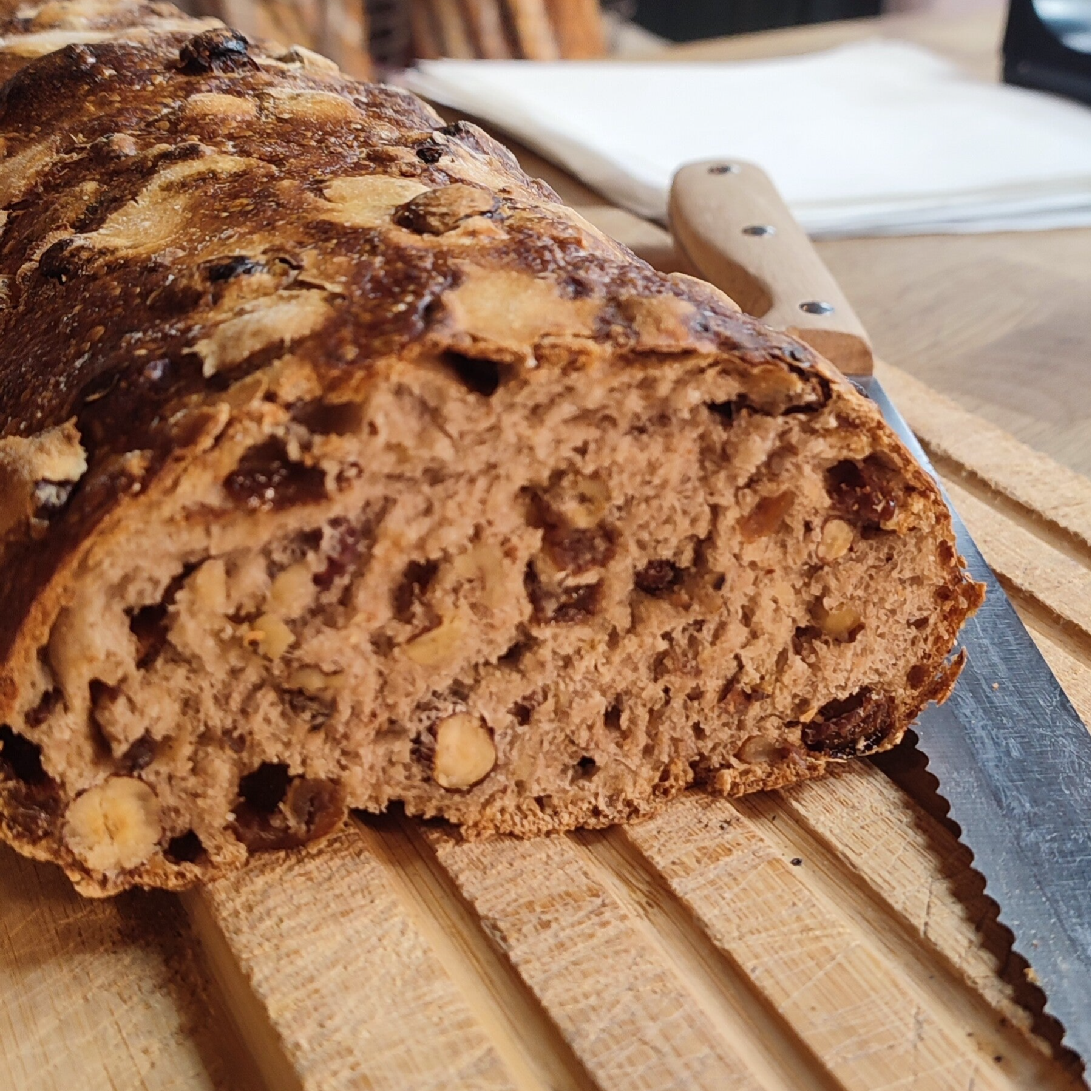 Un pain gourmand et rustique à base de farine de blé, enrichi de céréales, de noix, de noisettes et de raisins secs. Un goût légèrement sucré et une texture croquante. La quantité est limitée, nous vous conseillons de le commander la veille.