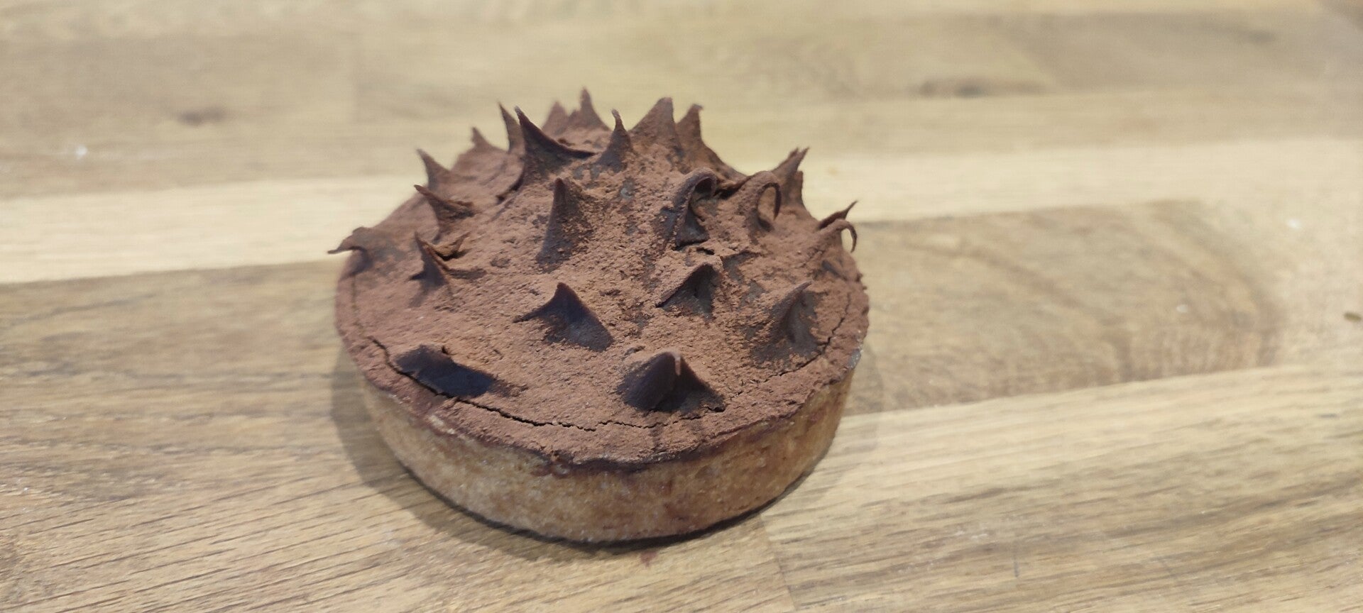 Une ganache fondante, au goût puissant de chocolat, décorée des petits pics emblématiques et saupoudré de cacao.