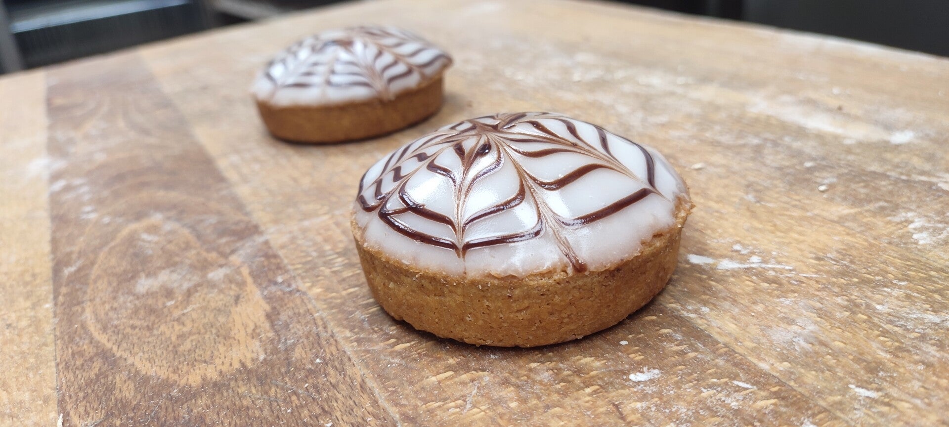 La pâtisserie traditionnelle de l'hiver, composée d'une pâte sucrée garnie d'une crème d'amande et d'une crème de marrons onctueuse. Elle est recouverte d'une couche de glaçage fondant blanc et décorée d'un motif en chocolat.