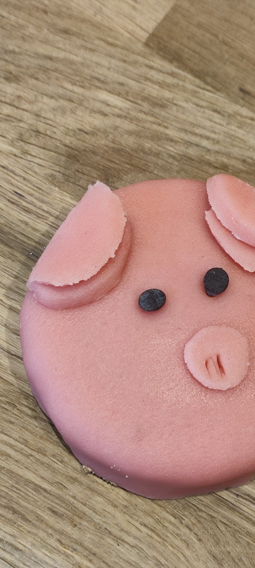 Une délicieuse confiture de framboise entre deux disques de génoise moelleuse, recouverts d'une pâte d'amande rose, soigneusement façonnée en forme de petit cochon.