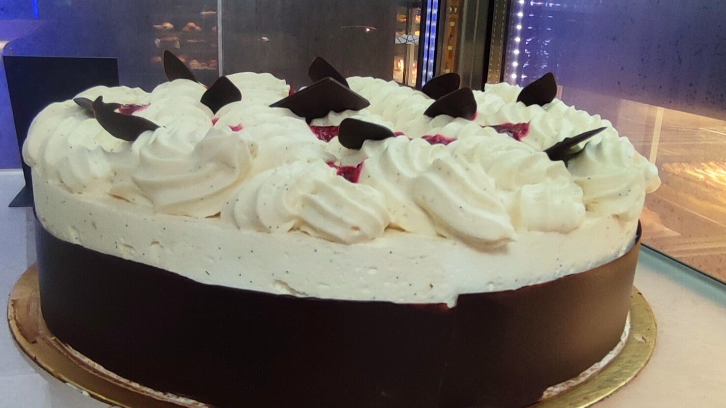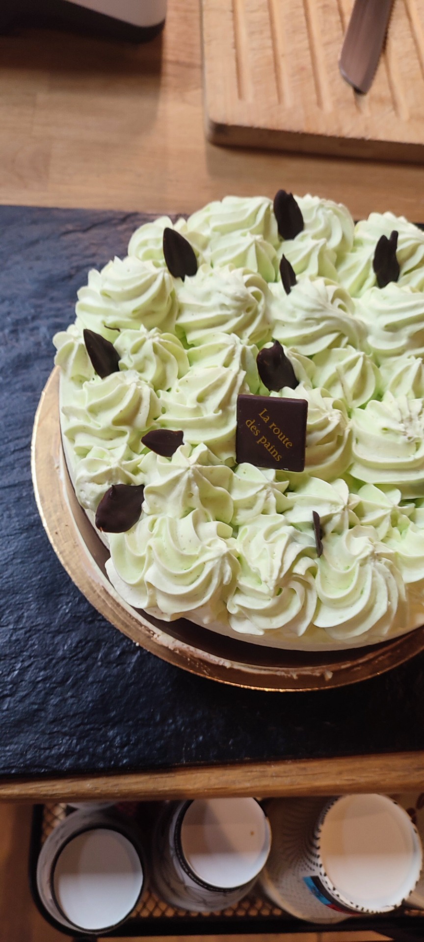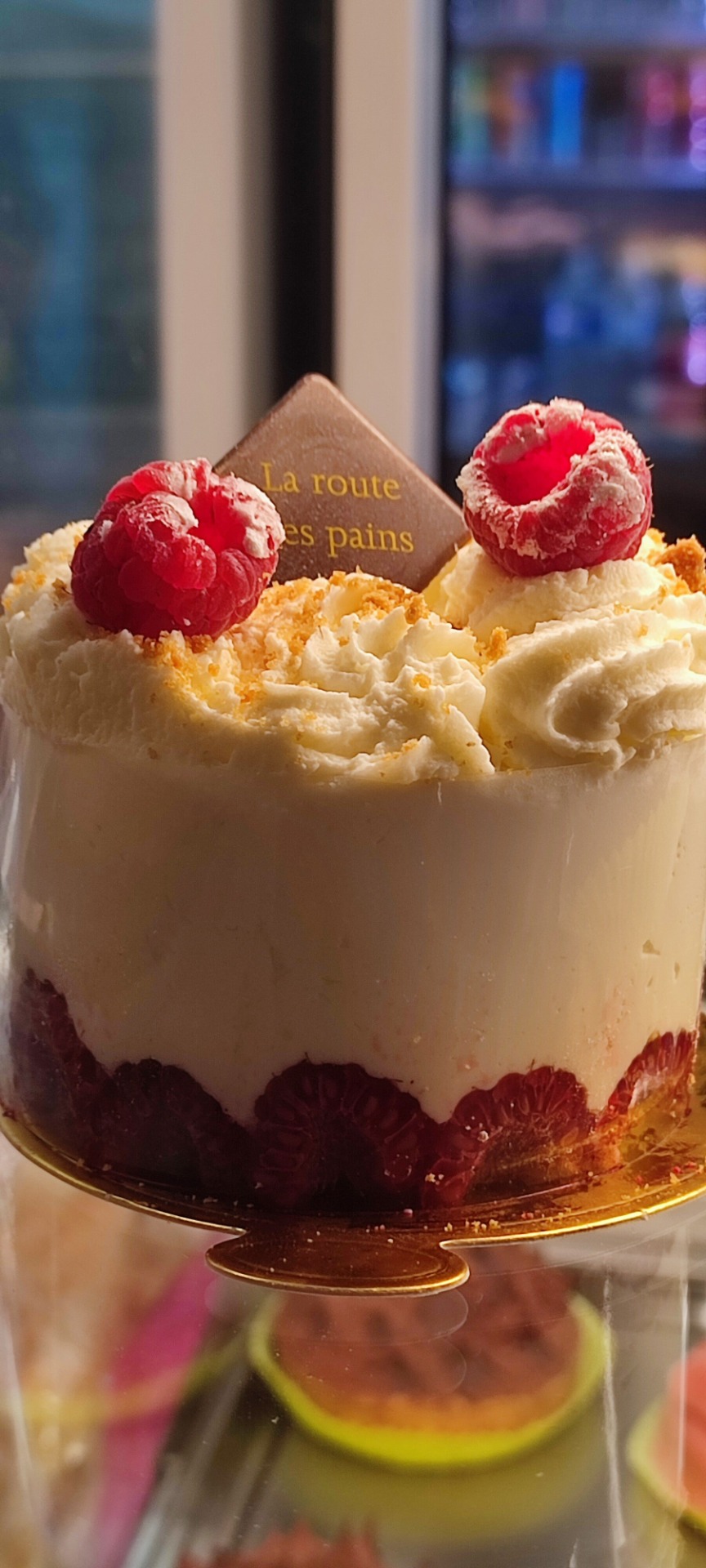 Un généreux disque de génoise, recouvert d'une belle couche de framboises fraîches et d'une chantilly parfumée à la pistache soigneusement pochée sur le dessus et décorée de pétales de chocolat noir. Elle est cerclée d'un ruban de chocolat noir.