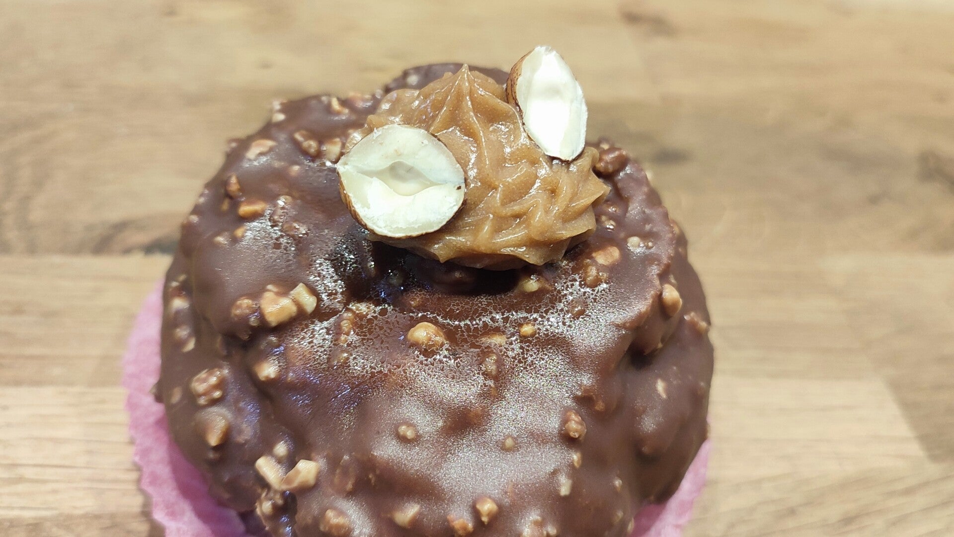 Un Choux recouvert d'un glaçage au chocolat au lait et aux noisettes façon "Rocher", généreusement garni d'une ganache au praliné et d'une délicate couche de gelée de citron