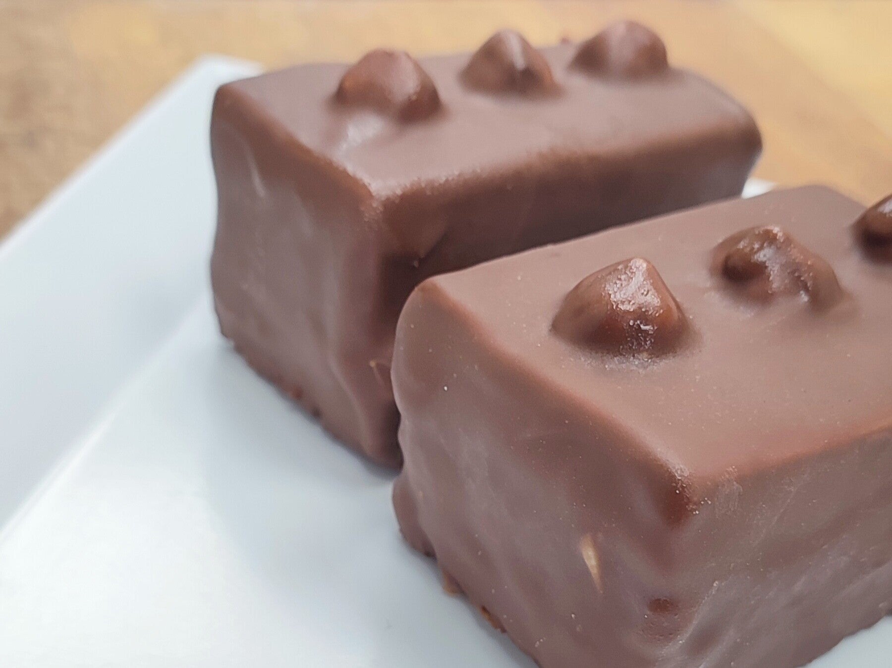 À la suite d'une production trop importante de brownies, il décide de les détailler en petits rectangles et de les nappés d'un caramel crémeux au beurre salé. Puis, grand amoureux du chocolat qu'il est, il y ajoute une onctueuse mousse au chocolat noir, quelques noisettes et nappe l'ensemble d'un enrobage au chocolat croquant.