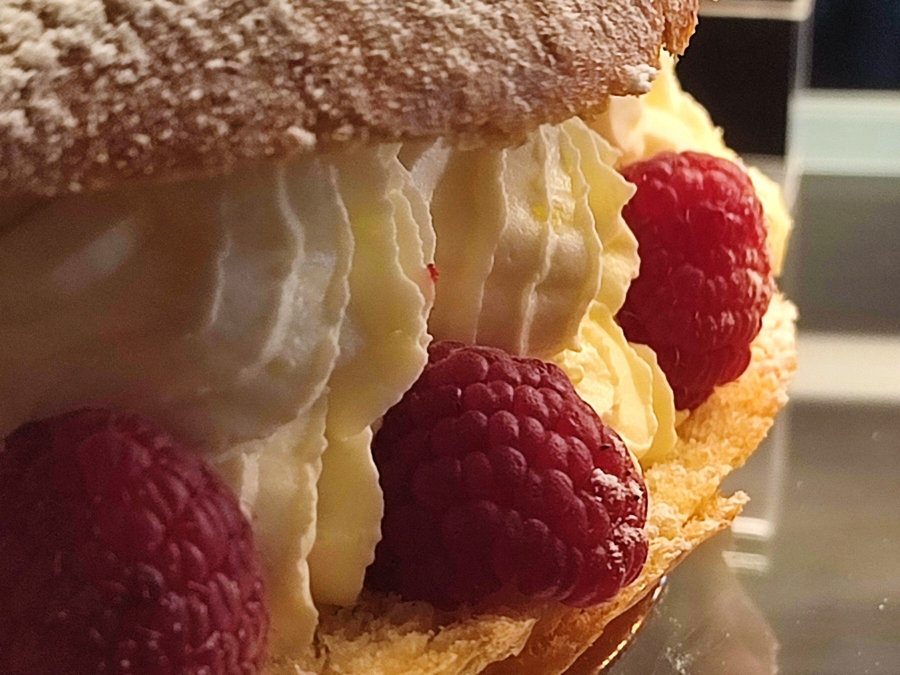 Une brioche ronde moelleuse, coupée en deux et garnie d'une généreuse couche de crème au beurre onctueuse, parfumée à la vanille, et décorée de framboises fraîches.