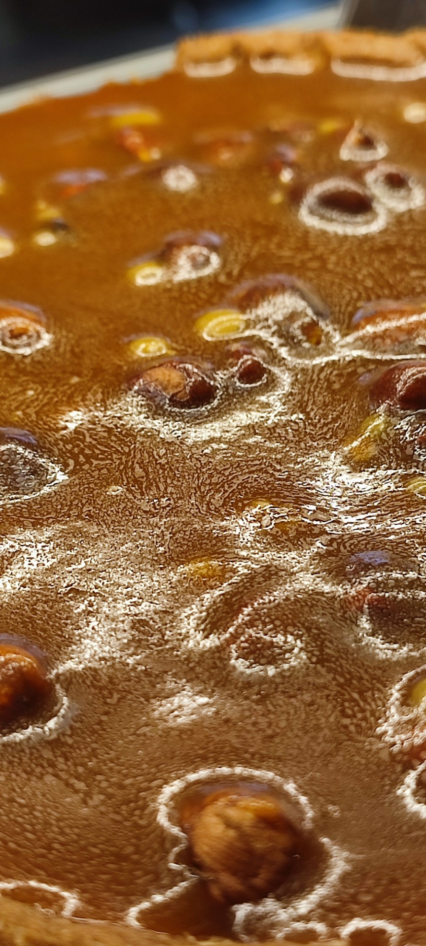 Une pâte sablée croustillante garnie d'un mélange fondant de caramel, de crème et de noisettes croquantes.