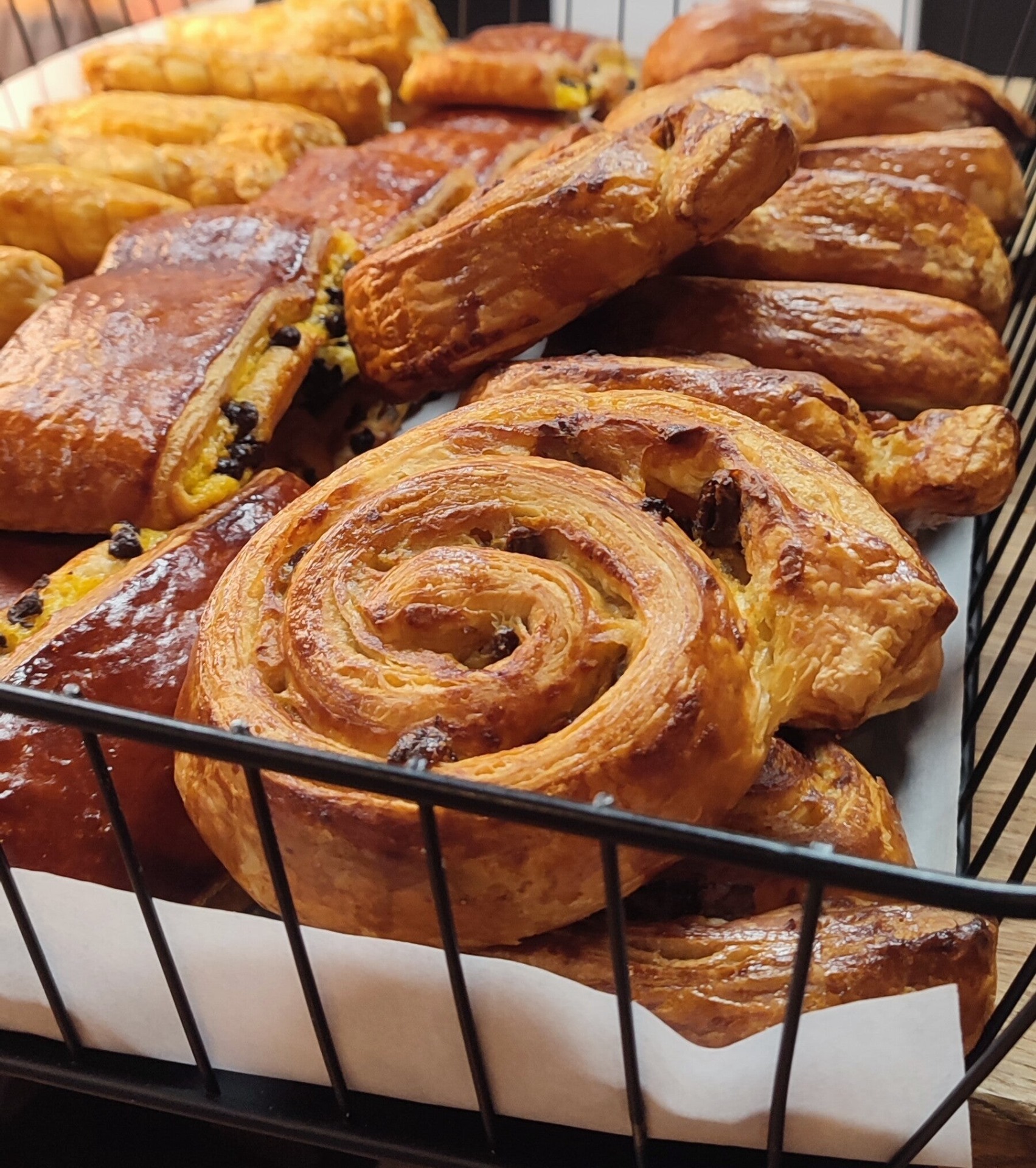 Le tourbillon feuilleté, garni de crème pâtissière et de raisins secs.