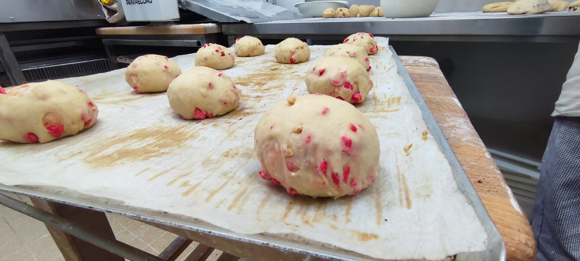 Brioche en portion individuelle, généreusement garnie de pralines rose de Lyon.
