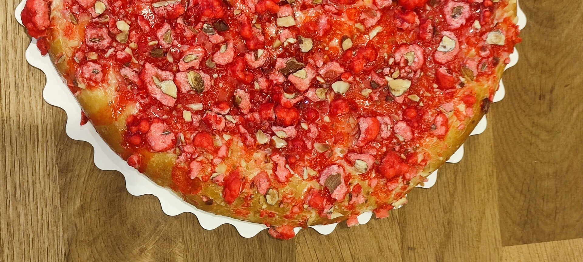 La spécialité de l'Ain, La Tarte ou Galette Bressane est confectionnée à partir d'une boule de pâte briochée abaissée à la main par notre boulanger, recouverte de crème et de pralines roses de Lyon, puis cuite selon la tradition dans notre four à pain.